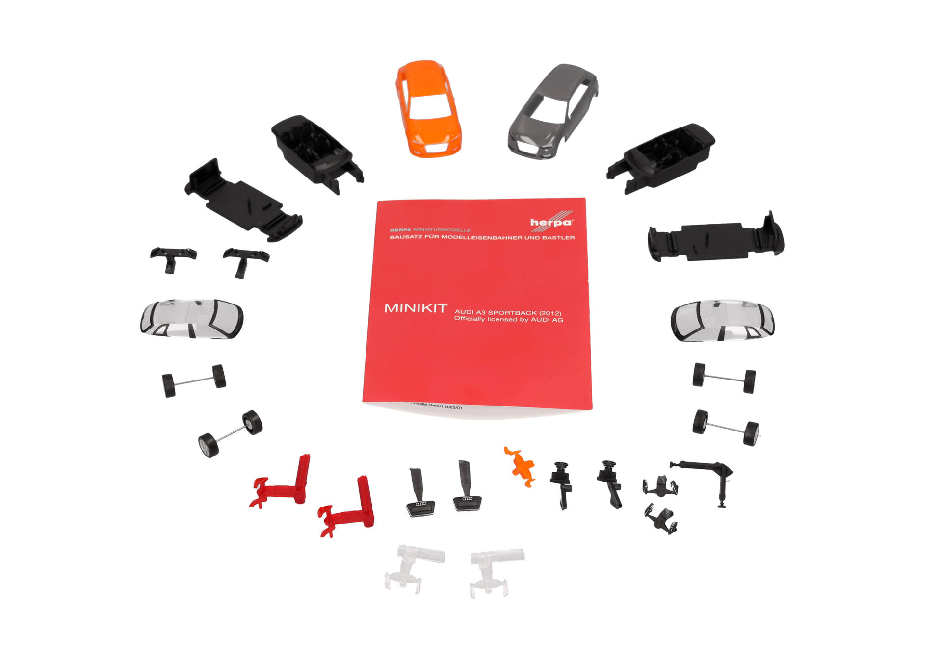 MiniKits sind original Herpa Modelle als Bausätze für Modelleisenbahner und Sammler. Der Audi A3 Sportback (2012) ist ein neues Modell im Bereich der MiniKits und erscheint zunächst in glutorange und nardograu. MiniKits lassen sich aufgrund der Herpa Schnappbauweise mit wenigen Handgriffen ohne Kleber zusammenbauen (Montageanleitung liegt bei). So kann die Modellanlage preiswert mit Autos bestückt oder ein Autotransportzug günstig mit PKW beladen werden.Und Airbrusher können vor dem Zusammenbau die Karosserie in der eigenen Wunschfarbe lackieren.