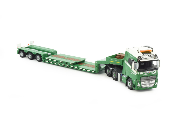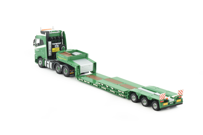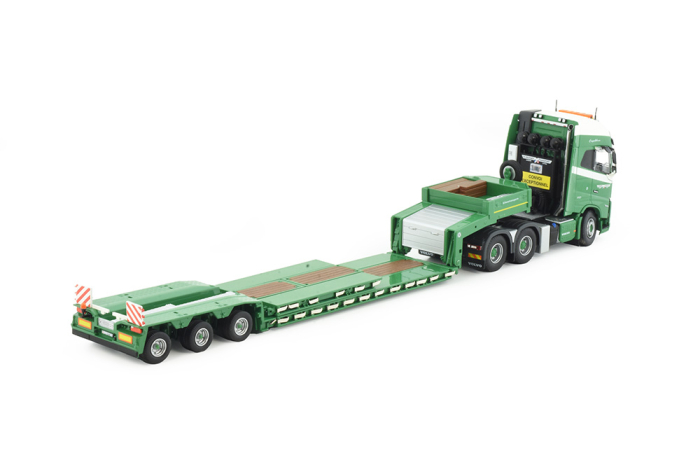 Das Fahrerhaus des Volvo FH ist mit großer Sorgfalt gestaltet – inklusive Innenausstattung, Kühlergrill, Scheinwerfern und fein bedruckten Emblemen. Der mehrachsige Tieflader verfügt über eine authentische Ladefläche und eine solide Konstruktion für den Transport von Baumaschinen oder übergroßen Lasten.
